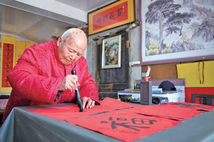 顾汝询家,春节从不用印刷春联。每年腊月二十六起,顾汝询便开始研墨铺纸,免费给有需要的人赠送春联、福字,这一写就是几十年。他的作品笔力浑厚,结构舒展,不少外地游客也慕名而来求字祈福,老人从不拒绝:“能送人‘寿’字,是福气。”