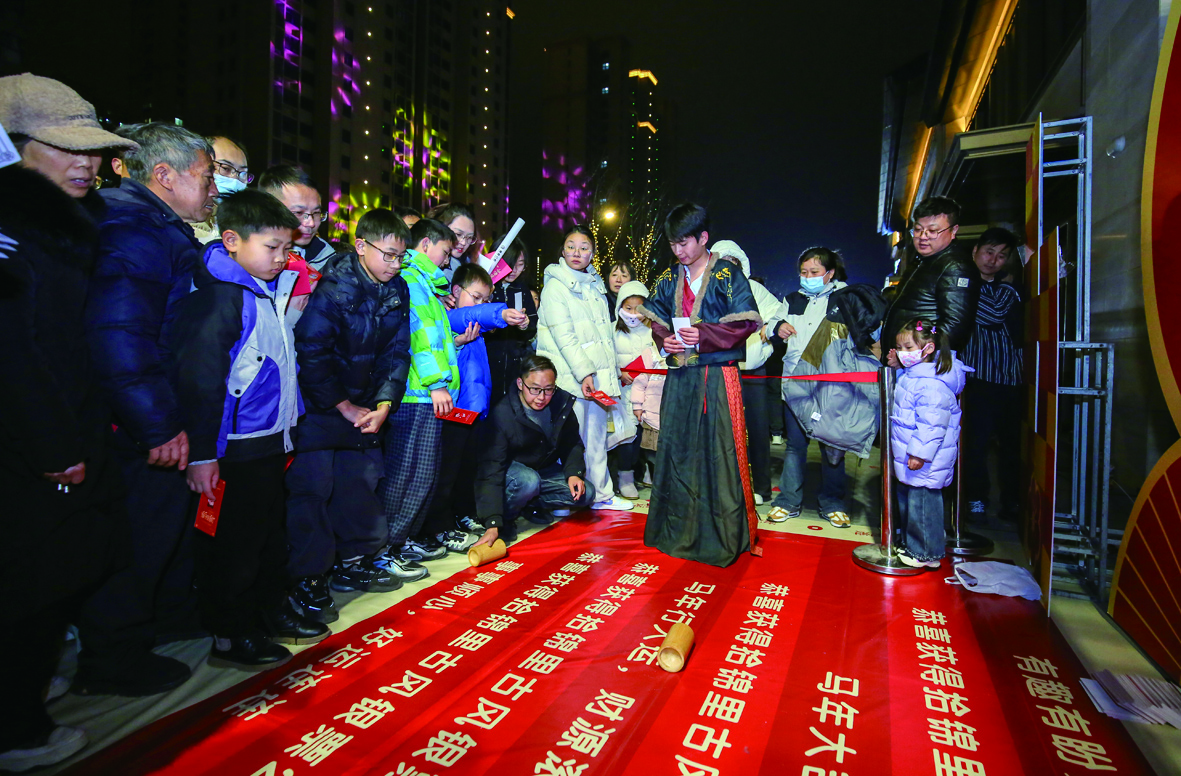 东广场上,梅花桩舞狮表演率先点燃了现场气氛。只见威风凛凛的醒狮在数米高的桩阵上腾挪跳跃,时而昂首甩尾,时而俯身探宝,每一个动作都精准有力,引得现场观众阵阵喝彩。市民许晖说:“梅花桩舞狮太震撼了,孩子看得目不转睛,特别有氛围感,既能让孩子感受传统魅力,又能体验元宵节的热闹。”