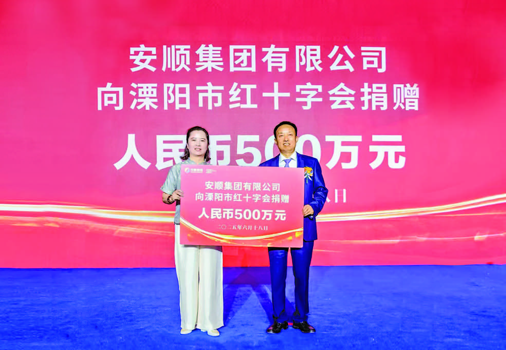 (张浩) 6月18日,安顺集团举行成立25周年庆祝活动。现场,安顺集团有限公司向溧阳市红十字会捐赠500万元。