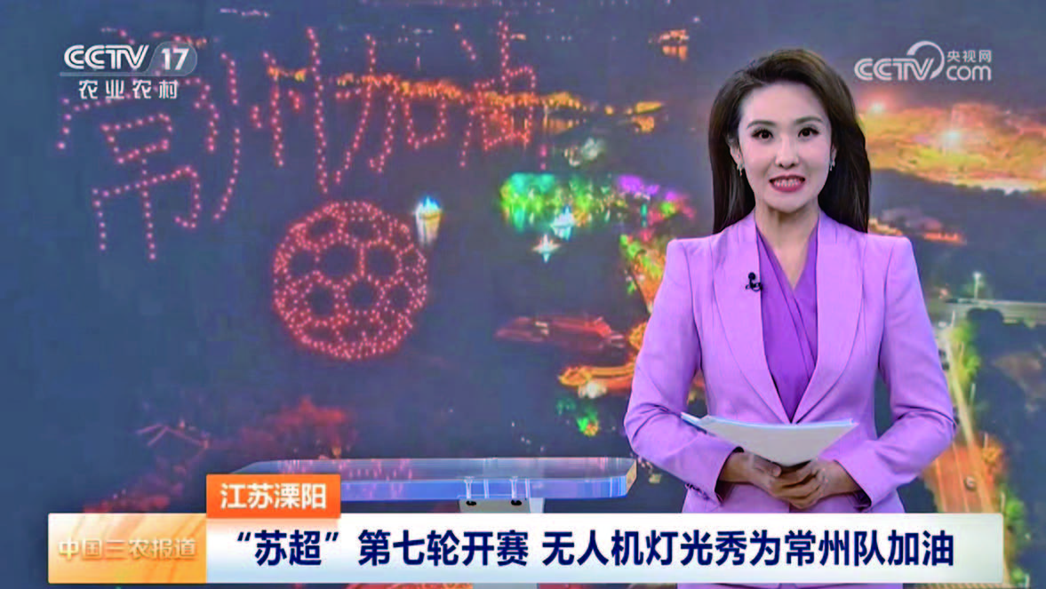 (殷俊) 7月20日晚,央视农业农村频道《中国三农报道》栏目以“江苏溧阳:‘苏超’第七轮开赛 无人机灯光秀为常州队加油”为题,专题聚焦我市天目湖的无人机灯光秀。