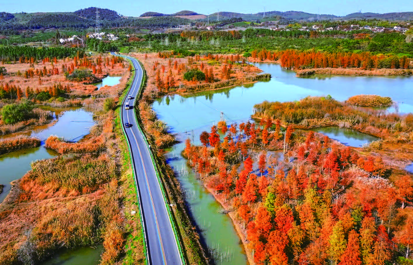 (史茵杰) 11月中旬至12月中旬,是水杉树的最佳观赏期。日前,记者在大溪水库、大栗滩等地看到,大片的水杉林已经换上了美丽的“彩妆”,红叶与绿叶相互交织,明艳色彩倒映在波光粼粼的水面上,如一幅幅绚丽的油墨画,美不胜收。