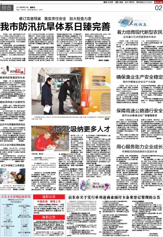 在完善预案、加强队伍建设的基础上,我市还十分注重台风汛期的防汛检查监督。大力开展水利工程检查,组织对江海堤防、水闸等水利工程设施以及防汛物资配备等进行全面检查,及时做好各类水利工程水工建筑物、机电设备及其配套设施的维护和检修。去年,我市先后实施了头兴港、连兴港、三和港、灯杆港等港支堤的维修工程,并对蒿枝港下游翼墙、塘芦港新闸上游翼墙栏杆、红阳港及三和港工作桥进行了维修改造。在台风“海葵”影响我市期间,全市各相关部门全面落实防汛抗台工作,共有30000多人安全转移,1000多条渔船进港避风;吕四港经济开发区准备了800只防风编织袋、800吨石子、60000平方米土工布等防台物资。2012年,我市共计开闸排涝189潮次,排水14000多万方,引水25万多方,全市内河水质得到有效置换和改善。